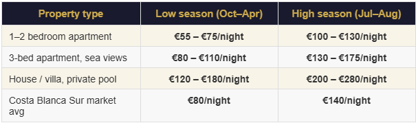 Average nightly rate: Costa Blanca Sur 2025–2026
